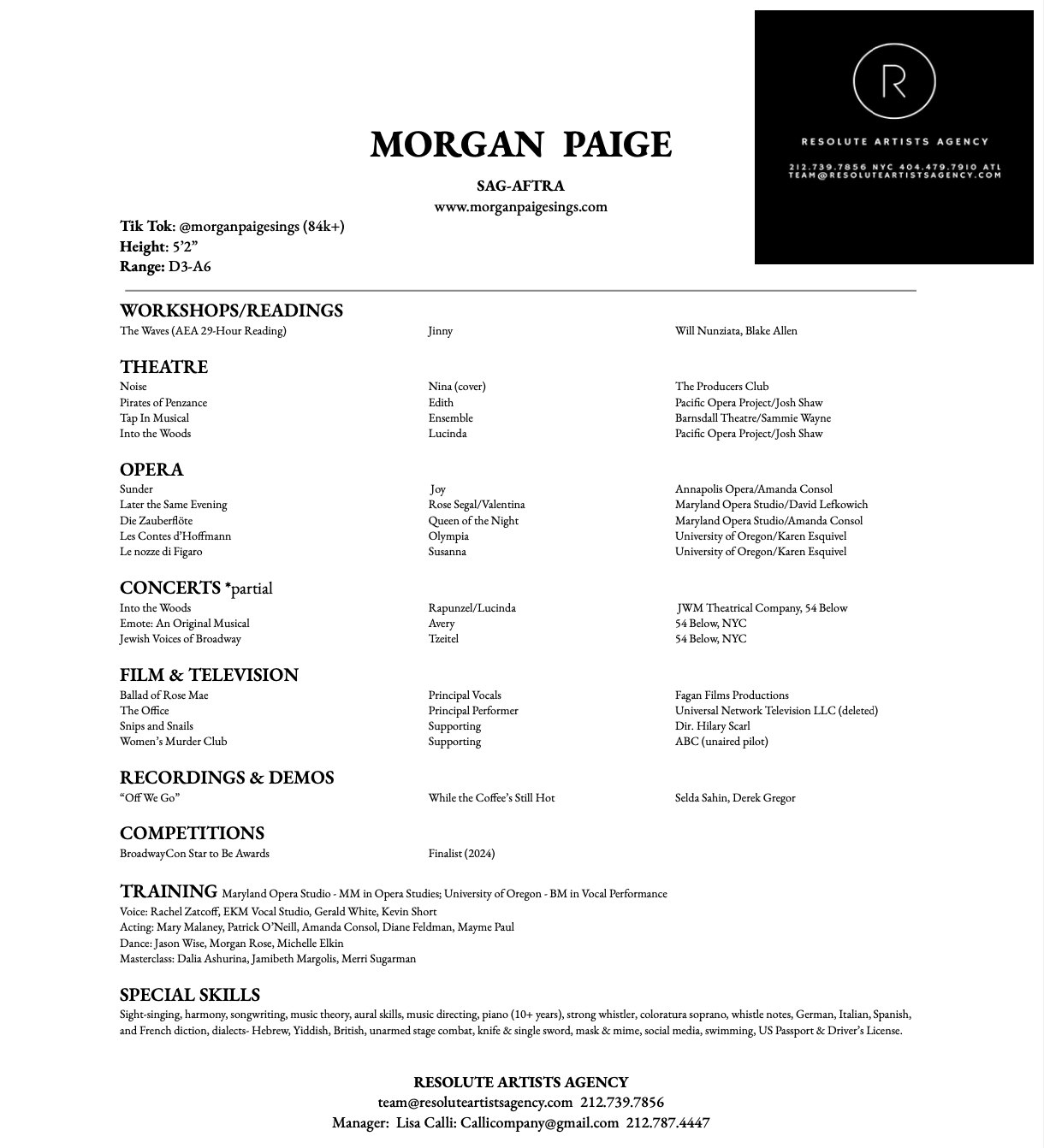 ABOUT MORGAN Height: 5’2”Range: D3 - A6 (Opera / Mix Belt)Email: morganpaigesings@gmail.com Headshot Download Resume Download Photography: Cameron RadiceInstagram: @cameronradicephotographyFacebook: @cameronradicephotography